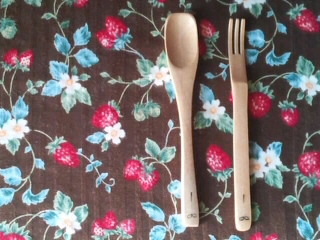 木のカトラリーはサイズ的にデザート用かな。