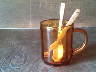 木のカトラリーとアンバー色のグラスマグ。
